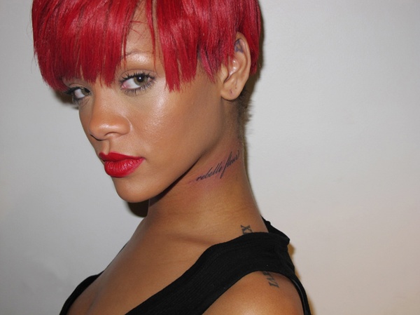 24-летняя звезда давно известна своей любовью к украшению тела чернилами, и на сегодняшний момент в ее коллекции уже 19 татуировок. Первую из них Рианна сделала в 2006 году в Китае на свое восемнадцатилетие. Тату расположена за правым ухом и представляет собой астрологический знак, означающий "рыбы". Этот маленький и элегантный рисунок сразу стал предметом обсуждения поклонников певицы, которые положительно восприняли это изменение в ее внешности. Именно с этой татуировки для Рианны началась новая эпоха увлечения росписи тела.
